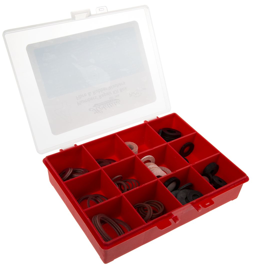 | Kit Contents | 1/2 in Ball Valve Seat Fibre Washer, 1/2 in Shower Hose Rubber Washer, 1/2 in Top of Tap Body Fibre Washer, 15 mm Fibre Tap Connector Washer, 15 mm Flexible Tap Connector Washer, 22 mm Fibre Tap Connector Washer, 22 mm Flexible Tap Connector Washer, 3/4 in Ball Valve Seat Fibre Washer, 3/4 in Top of Tap Body Fibre Washer, 3/4 in Washing Machine Hose Rubber Washer, Bath Shower Mixer Diverter Washer, Draw Off Cock Rubber & Fibre Washer |