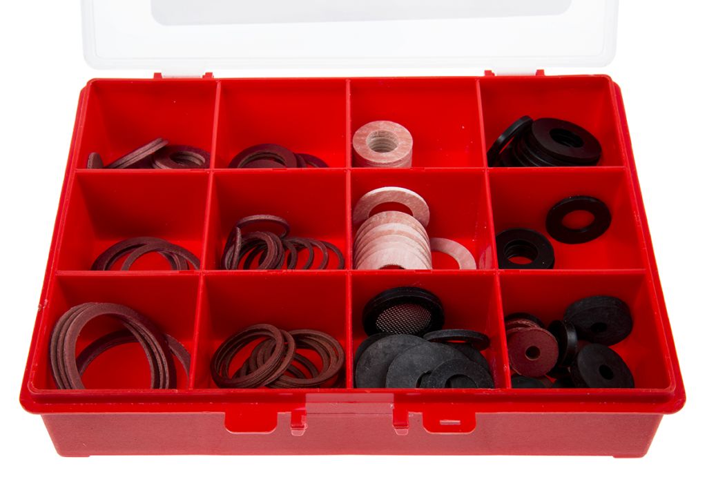 RS PRO 100 x Washer & Seal Kit, 12 Compartments, Kit Contents 1/2 in Ball Valve Seat Fibre Washer, 1/2 in Shower Hose