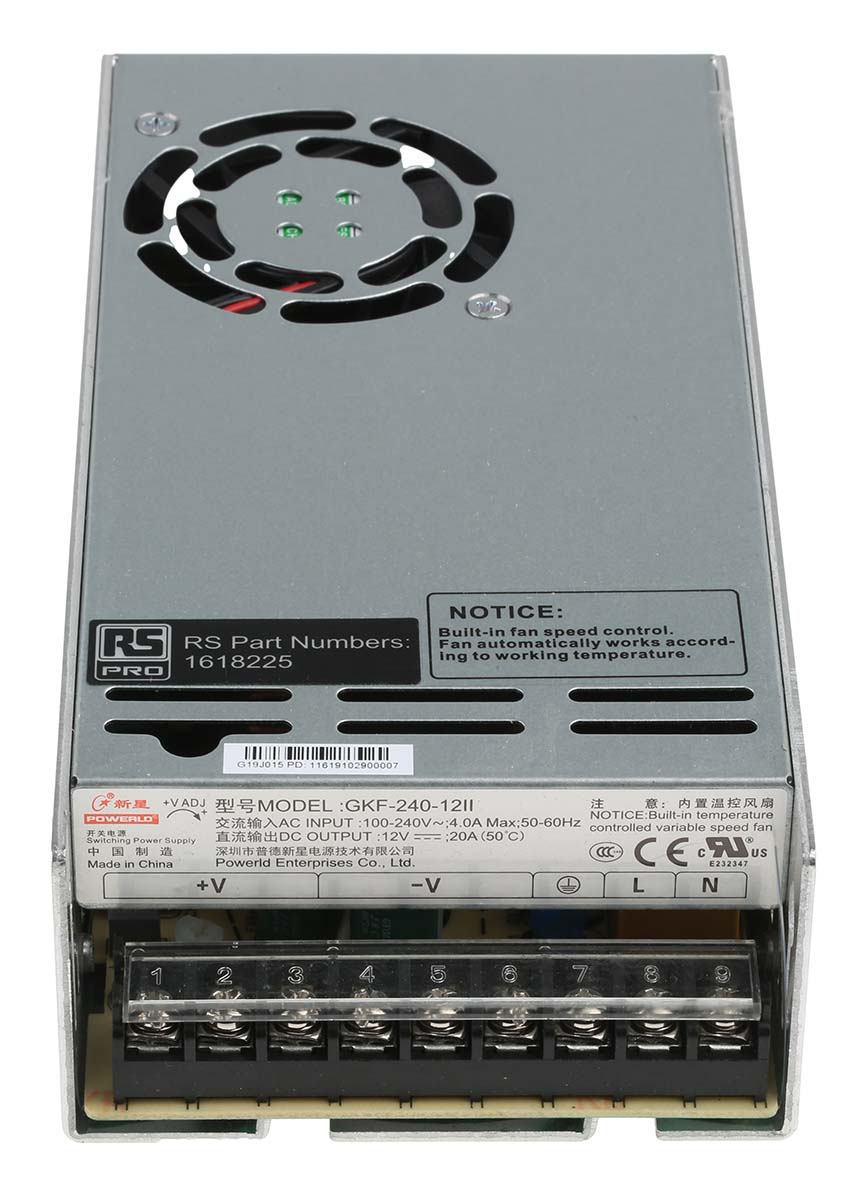 Product description RS PRO Embedded Switch Mode Power Supply SMPS, 12V dc, 20A, 240W Enclosed
