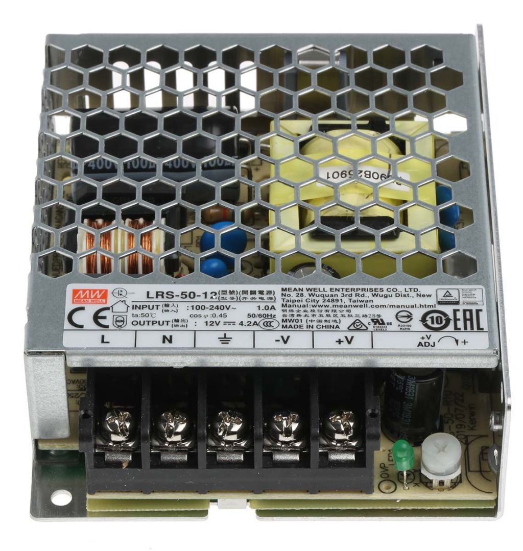 | Product description | Mean Well Embedded Switch Mode Power Supply SMPS, 12V dc, 4.2A, 50W Enclosed |