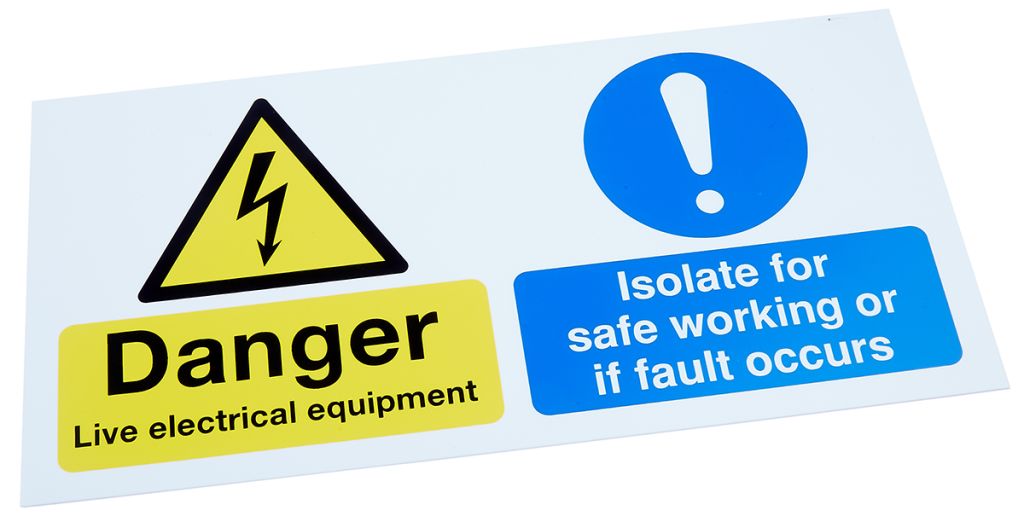 The RS Pro 763-1711 is a dual-message sign to warn of live electrical equipment and a mandatory message for safe working or faults.