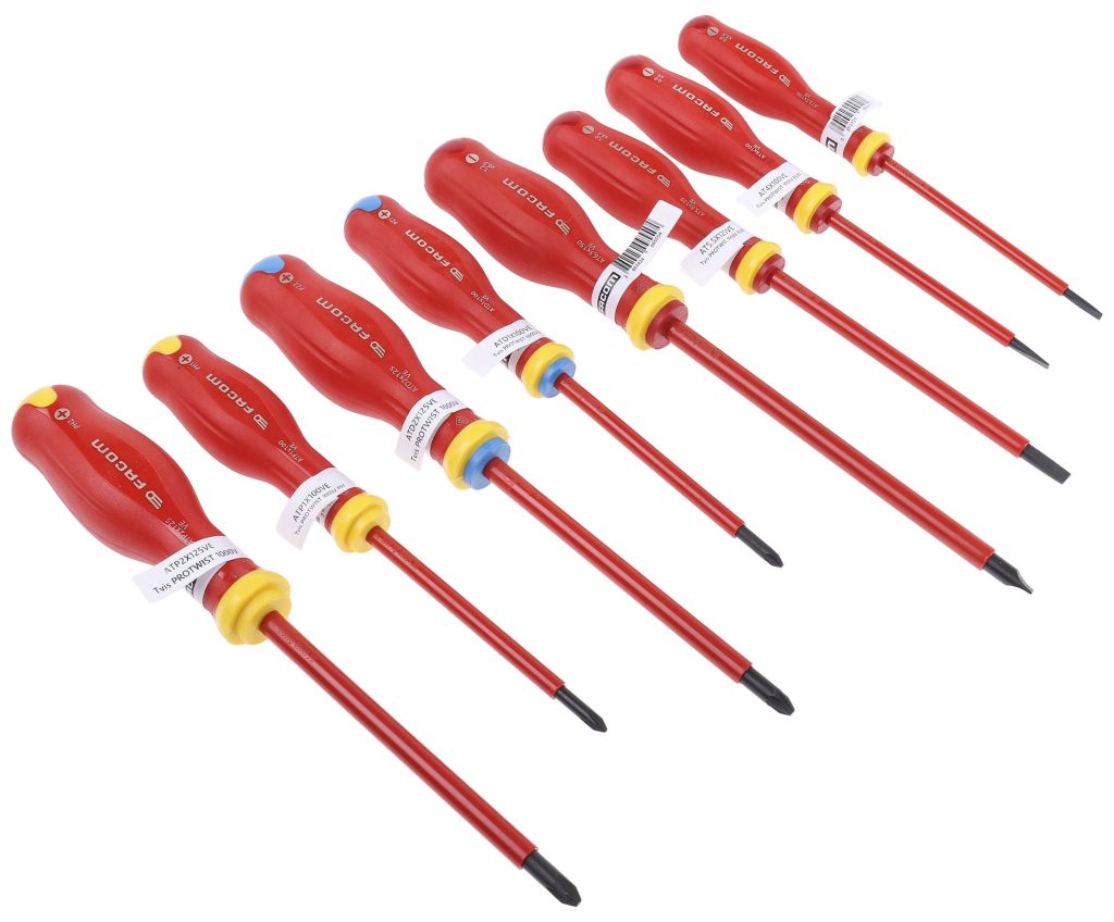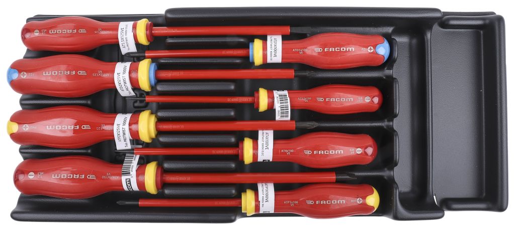 A professional set VDE insulated Facom Protwist 1000V screwdrivers which include both Slotted and Phillips with round hardened and tempered silicone carbon steel blades for strength and endurance. These insulated screwdrivers are designed for electrical safety and for working on live components up to 1000 Volts making this the perfect set for electricians. The protwist insulated screwdrivers offer excellent torque and allows fast screwing speeds. These 8 piece screwdriver sets are designed with a natural grip that gives the users great comfort and designed to last alot longer. These insulated screwdrivers provide both safety for the user and can also prevent damage to electronic parts that might be damaged by an electrical short. The colour coded ends and rings on these screwdrivers make it much easier to identify the right tool that you need even in a busy tool box.