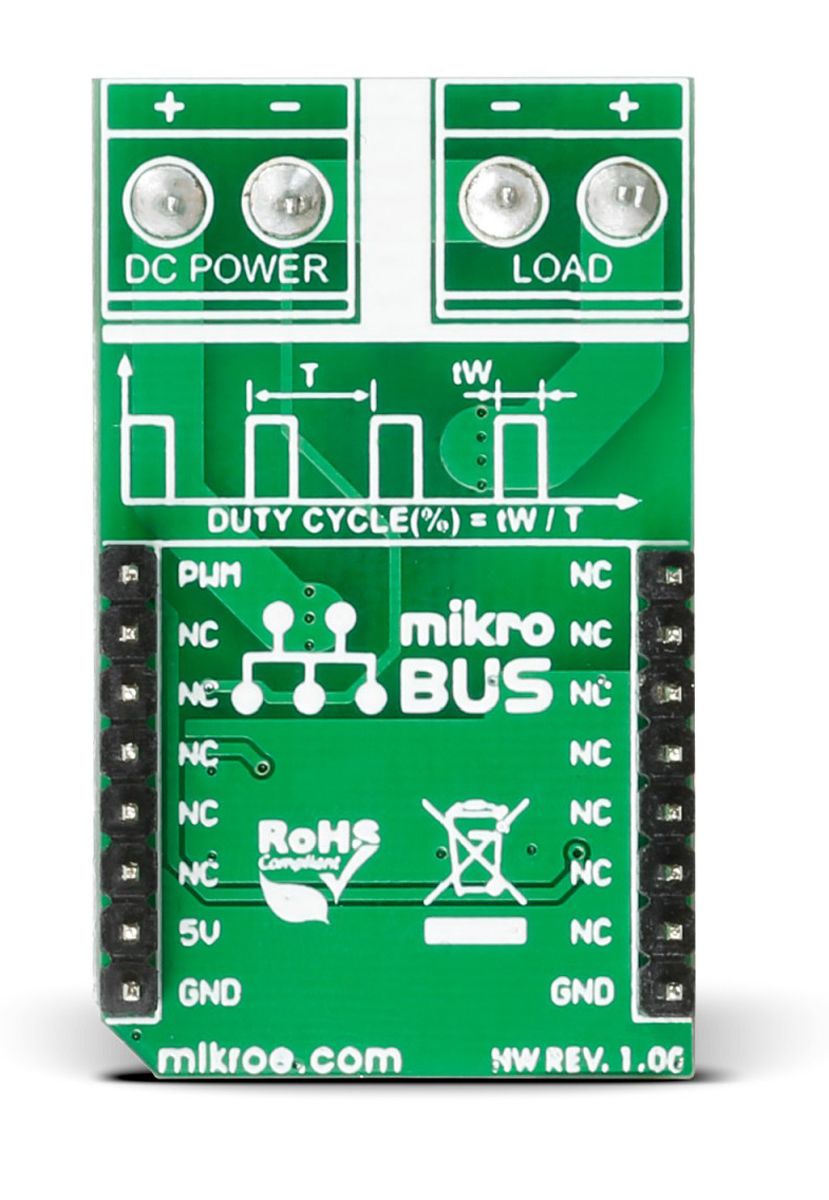 PWM driver click is a mikroBUS add-on board for controlling the DC motor speed or fast switch ON/OFF a DC load circuit. The Silicon Labs Si8711CC is a 5kV Digital Isolator with LED Emulator Input and Open Collector Output. A Pulse Width Modulation signal in the Digital Isolator drives the power MOSFET DMP3010LK3 which controls the load.