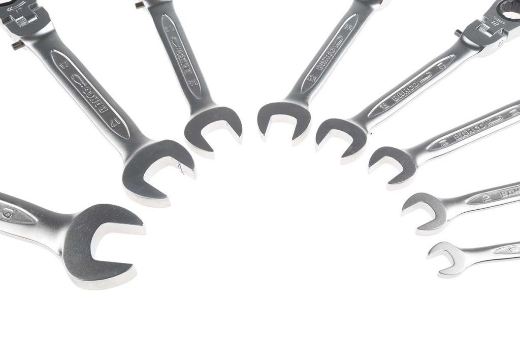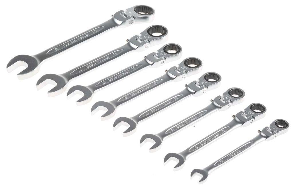 Professional, durable combination ratchet spanner set constructed from high performance alloy steel. The 12 point dynamic drive profile provides longer life to fasteners and with a small 5° action and flexible head that enables tightening in the most cramped of spaces.