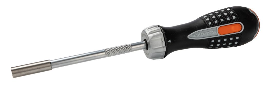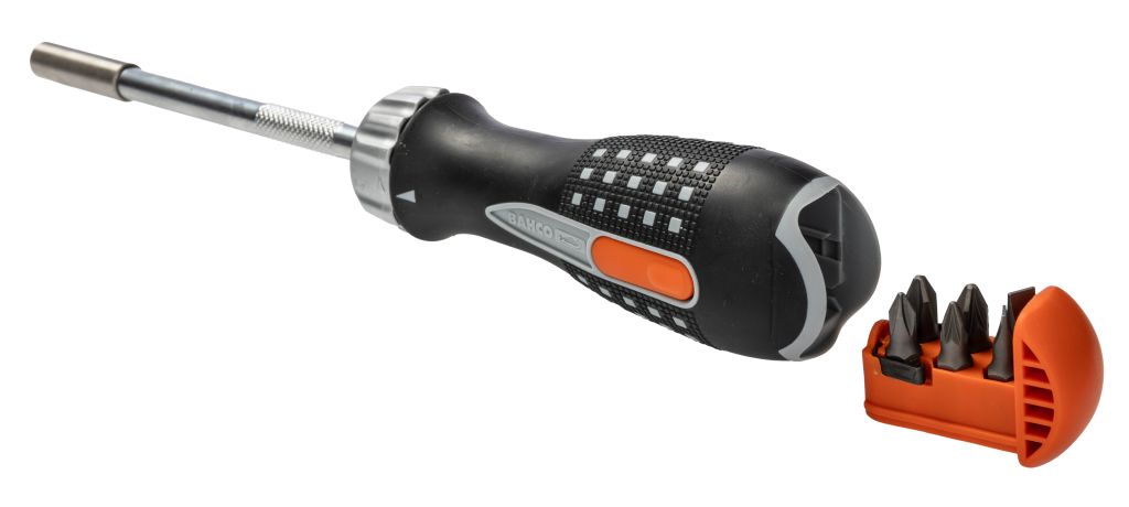 Bi-material ratcheting screwdriver with bits storage, includes six bits stored in handle with release button for quick access.