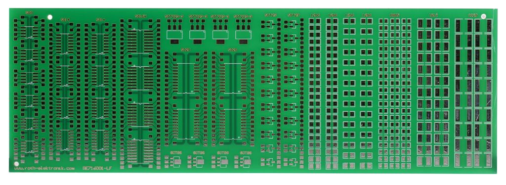 | Product description | RE716001-LF, Double-Sided SMD Soldering Exercise Board FR4 FR4 for 11 Multiple Types Packages 213 x 72 x 1.5mm |
