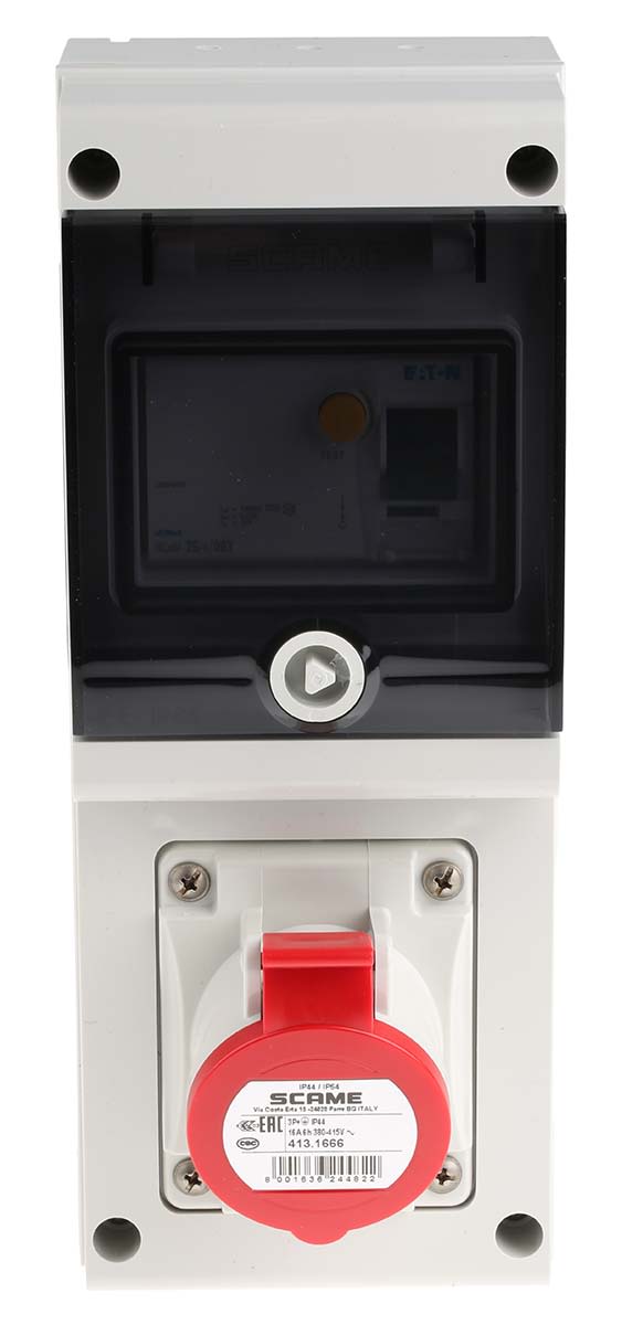 | Product description | Scame, DOMINO IP44 Red Wall Mount 3P+E RCD Industrial Power Connector Socket, Rated At 16A, 415.0 V, 632.1616-R |