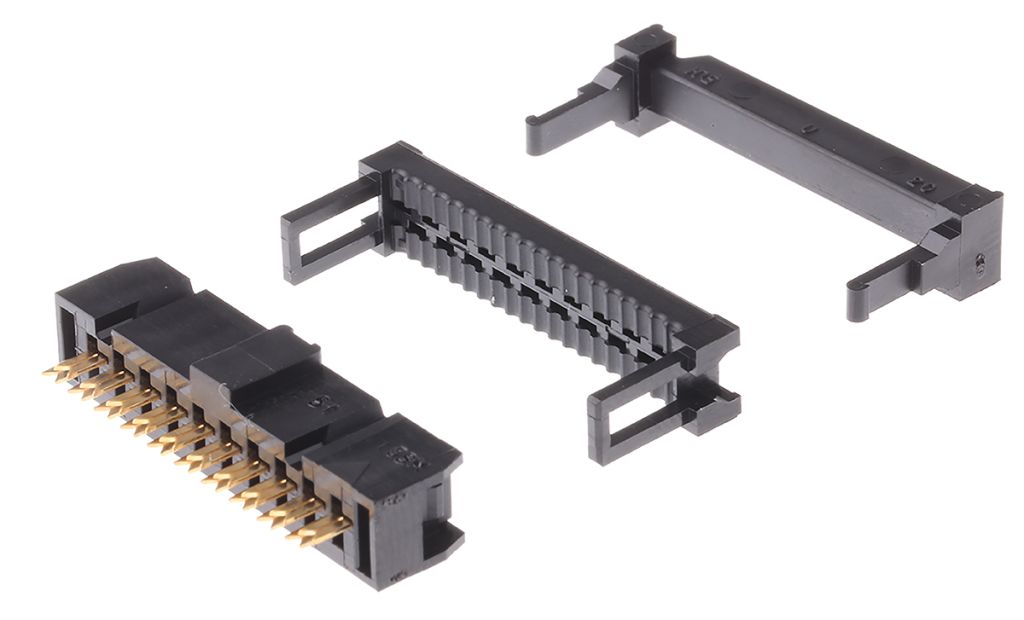 HIF3B series 2.54mm IDC ribbon cable socket connectors made from black UL94V-0 PBT with a double row contact alignment. These HIF3B series IDC ribbon cable sockets are MIL standard compliant (apart from 6 and 10 pole versions), have a mis-insertion mechanism comprising of polarizing guides and polarizing keyways along with a strain relief and accept UL2651 AWG 28 flat cable.