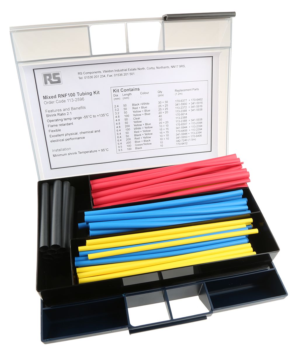 This kit contains a 450 pieces of RNF-100 heat shrink tubing in a variety of colours and sizes.