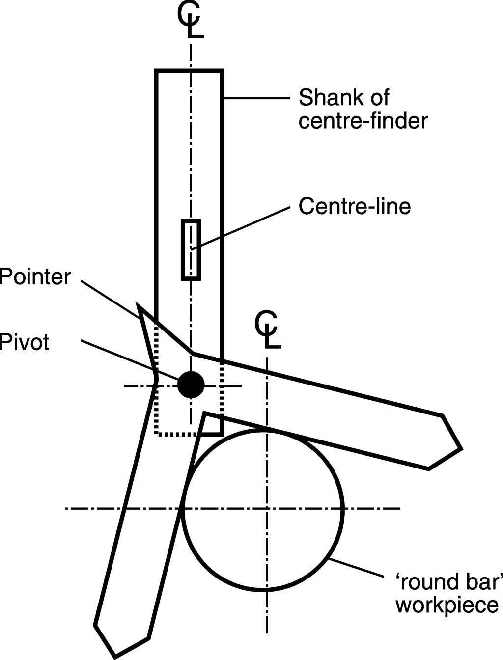 A simple, effective tool for use with drilling or milling machines for location of the centreline of round bar.