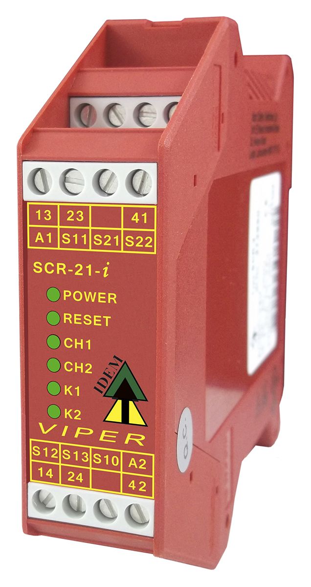 Professional range of IDEM VIPER Safety Relays with screw terminals. The safety relays incorporate expansion units. The relays can be directly wired to increase the number of safety output contacts. Designed to meet the latest safety standard and offer enhanced LED diagnostics and simplified wiring. Typical applications include safety interlock switches and emergency e-stop devices door guard monitoring.