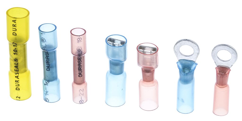 TE heat shrinkable pre-insulated nylon splices and crimp terminals provide reliable connections, especially where environmental sealing is important. Covering cable sizes from 0.5mm - 6.0mm², they are designed for use where water or condensation may be encountered, or where abrasion or mechanical abuse could be problematic. To complete a joint, the cable connector is crimped in the traditional manner, and the sleeving is then heated to shrink around the cable insulation. Special adhesive flows during the heating to seal the joint.