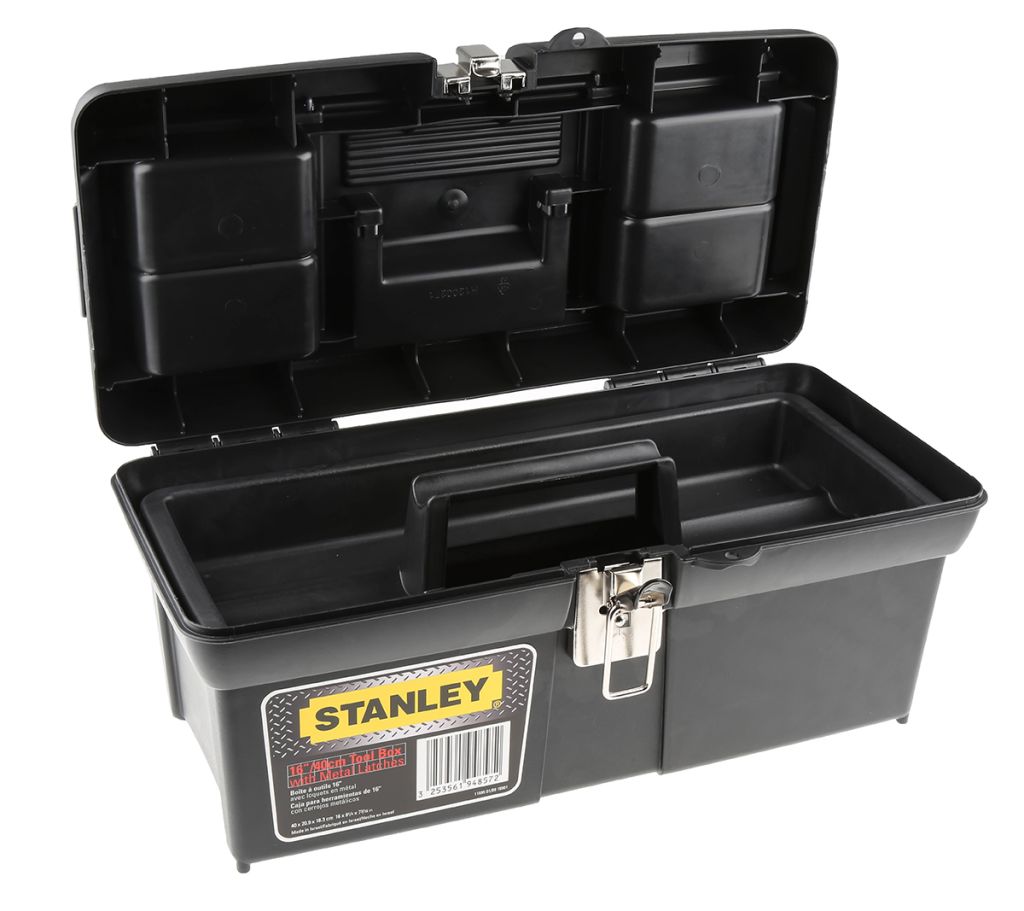 Introducing the Stanley metal latch tool boxes. Robust tool boxes with metal latches for secure fastening and a soft grip handle that folds flat into the lid. The tool box lid also consists of 2 compartment organisers for storing small parts or accessories and upon opening, there is a removable tote tray creating more space for larger hand tools such as hammers, power tools or screwdrivers. The tool boxes offers a built-in padlock eye so it’s lockable with a padlock.