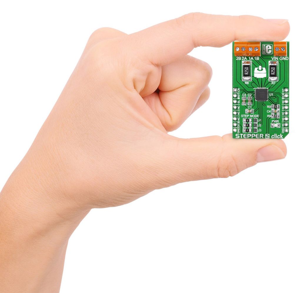 The Stepper 2 click is an add-on board that driver bipolar stepper motors in micro-stepping modes. The Allegro MicroSystems A4988, DMOS Micro-stepping Driver with Translator and Overcurrent Protection operates directly the 2-phase step motor windings. With the translator, it is easy to drive a micro-step on the motor by simply inputting one pulse on the STEP input.