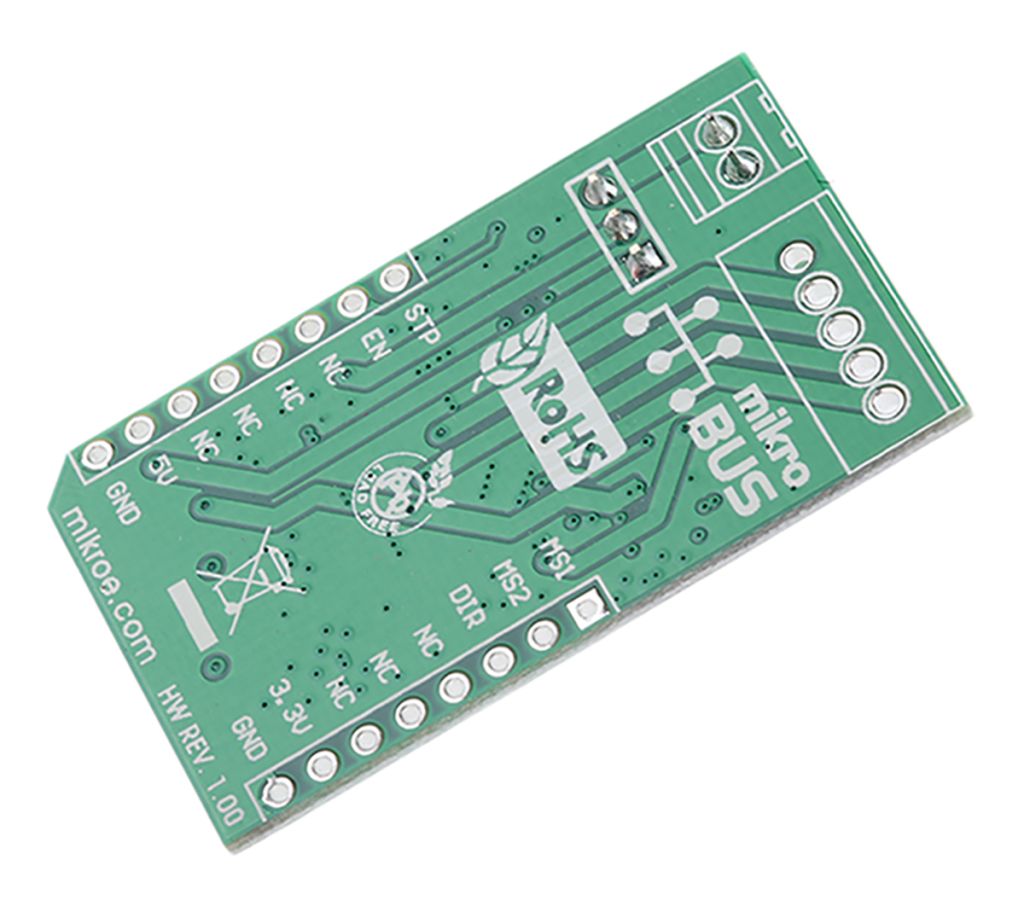 The Click accessory modules plug into the MikroBUS sockets in MikroElektronika microcontroller development boards. STEPPER click features a microstepping stepper motor driver with a built-in translator.