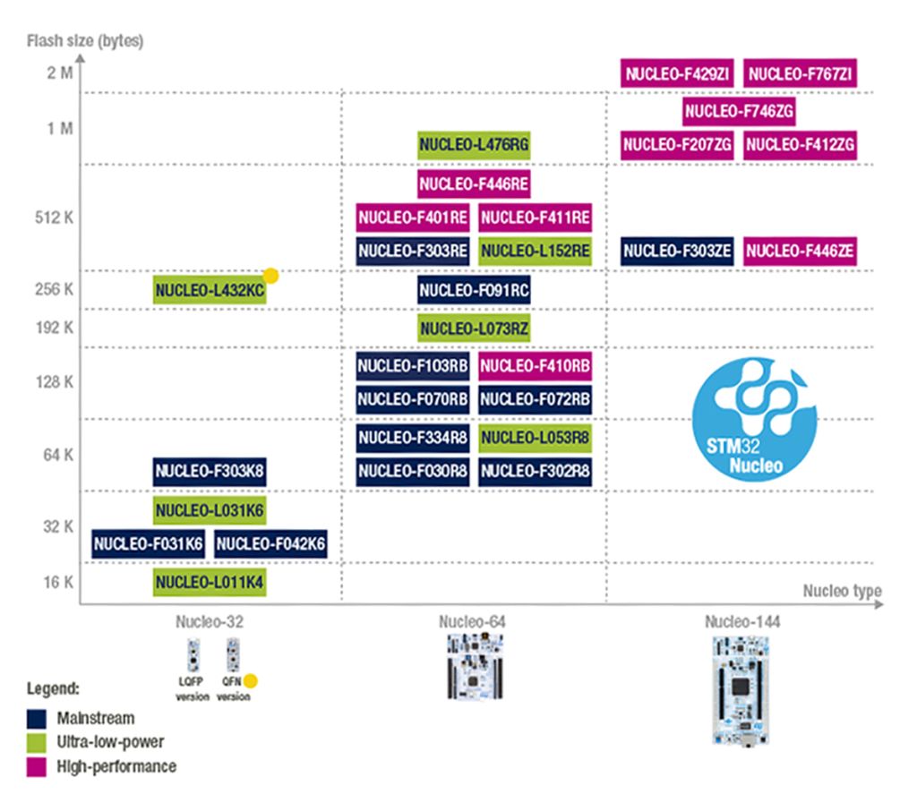 The ST range of Nucleo boards are ideal for quickly prototyping your designs and ideas. They all share the same connectors so it is easy for you to expand functionality with add-on boards. They offer tonnes of opportunity for developing applications.