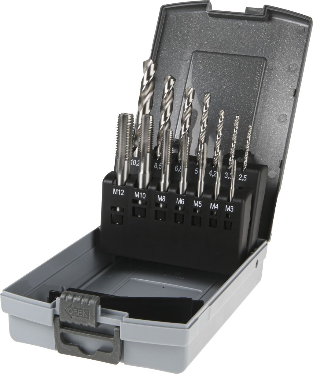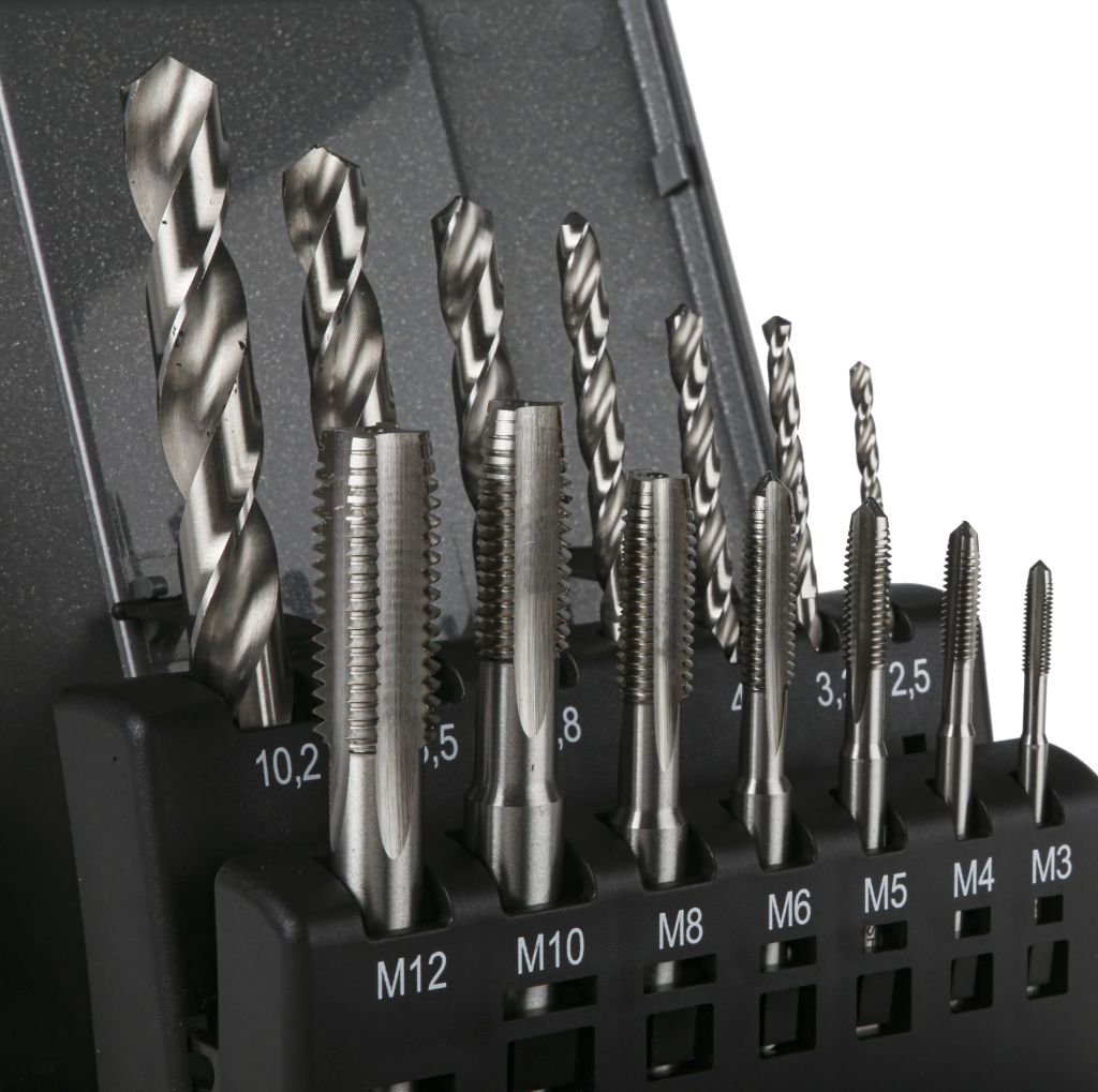 The 7 tap pieces are suitable for thread sizes M3 to M12 and the drill bits are suitable for 2.5 to 10.2 mm holes. This handy set is supplied with a durable case, ensuring excellent protection when not in use whilst keeping the pieces organised.