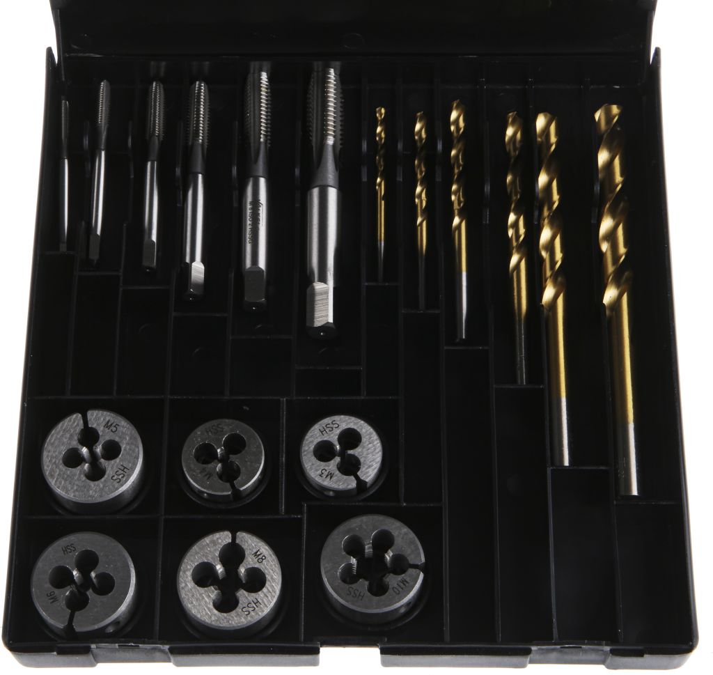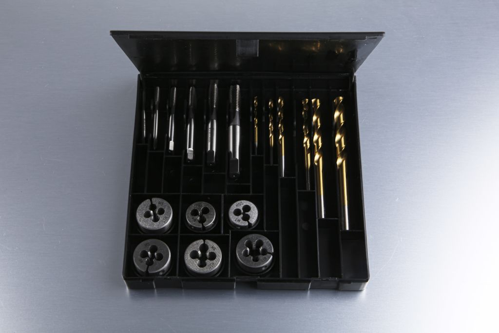 Drill sets are perfect for driving into a surface or material to create a hole whilst tap sets are ideal for cutting thread (tapping) into the hole, to create a clean fitting for bolts and other materials. The addition of dies allows for threading of materials such as steel rods, providing a clean thread for fittings to be secured to. Tap, die & drill sets combine all three, creating a versatile set that can be used in a wide range of applications. Tap, die & drill sets are used with hand tools and power tools such as tap wrenches and drills to achieve maximum torque and control. They are widely used in applications such as: