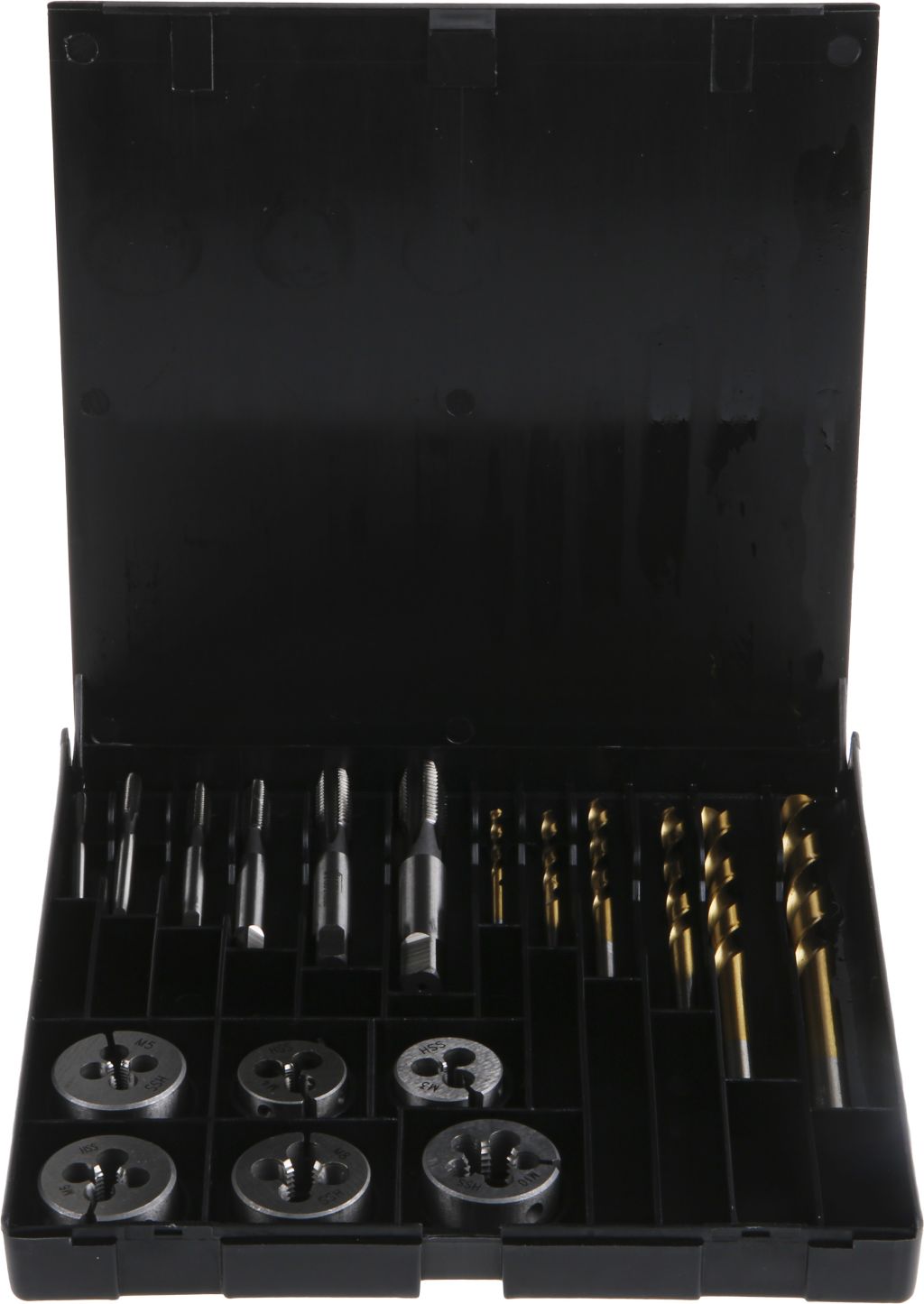 Drill sets are perfect for driving into a surface or material to create a hole whilst tap sets are ideal for cutting thread (tapping) into the hole, to create a clean fitting for bolts and other materials. The addition of dies allows for threading of materials such as steel rods, providing a clean thread for fittings to be secured to. Tap, die & drill sets combine all three, creating a versatile set that can be used in a wide range of applications. Tap, die & drill sets are used with hand tools and power tools such as tap wrenches and drills to achieve maximum torque and control. They are widely used in applications such as: