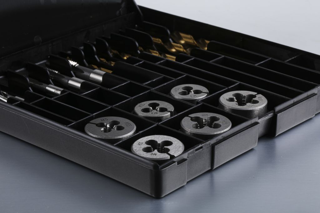 A tap set is used to create or repair threads in holes which is ideal for things such as nuts and fittings, this process is called tapping. Die sets are used to cut threads on materials such as steel rods to allow a fitting to be screwed on and attached, this is called threading.