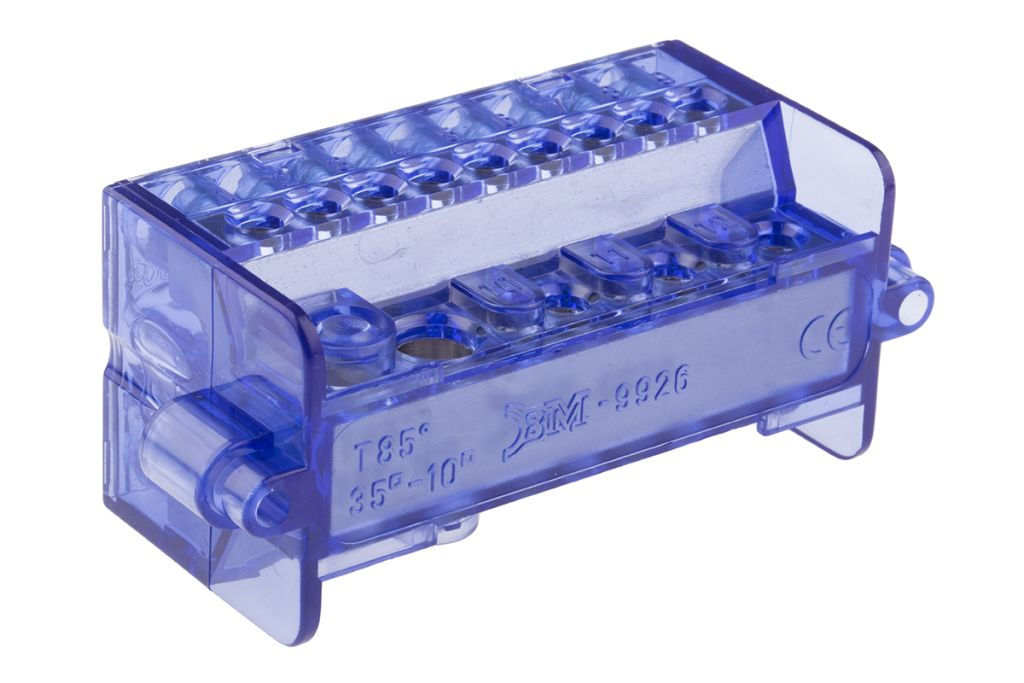 This terminal block is compact and provides a connection system on two levels which allows easy insertion of conductors. The brass connection bars are nickel plated for protection against corrosion and are contained within a transparent blue polycarbonate housing.