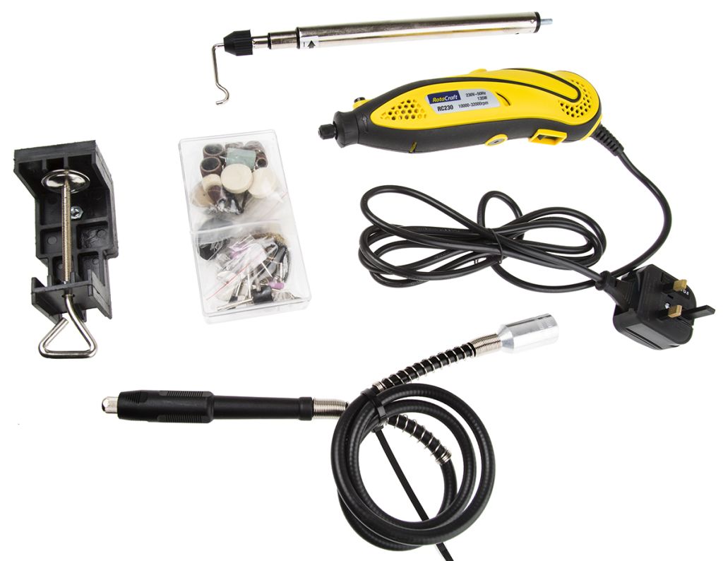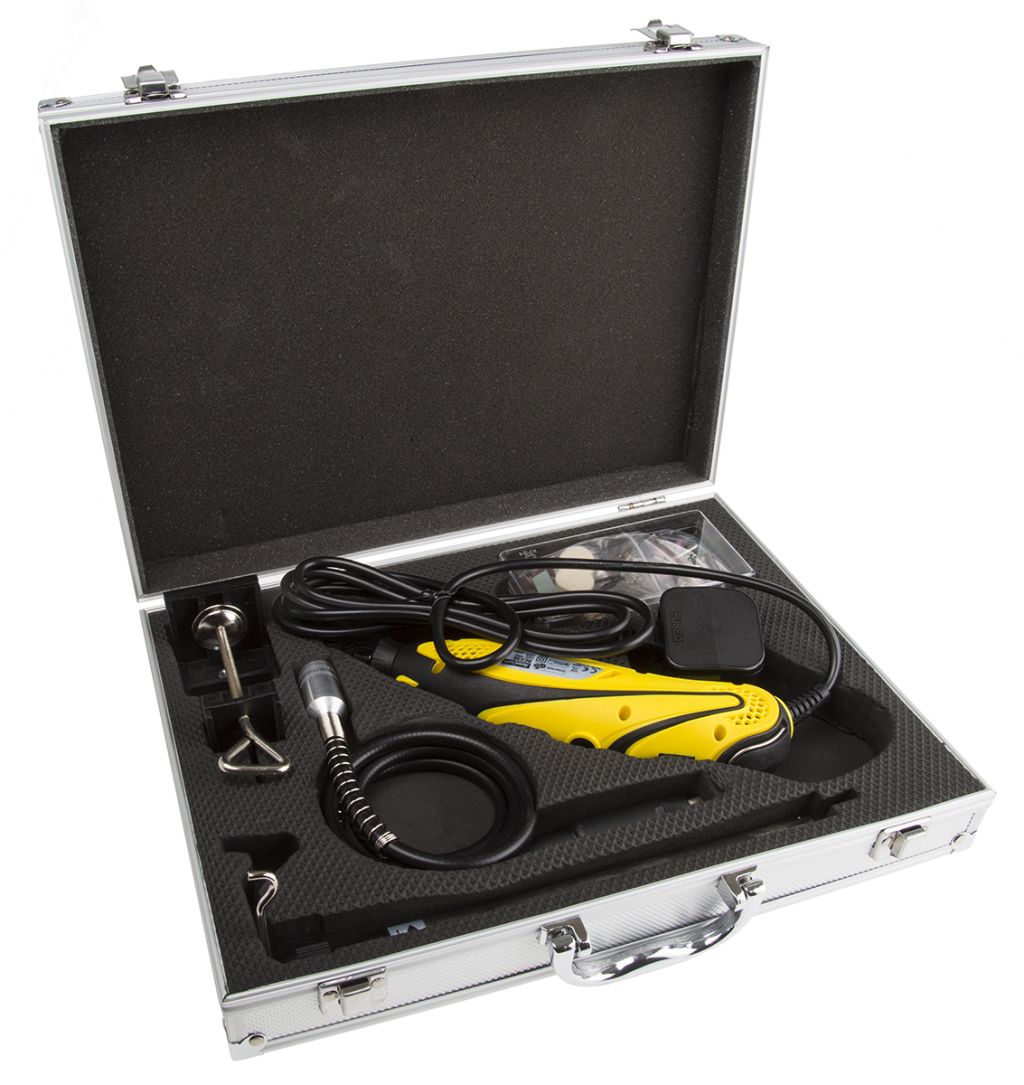 RS Pro versatile 230 V rotary tool with flexi-drive and telescopic hanging stand for working on a wide range of intricate precision jobs. Suitable for beginners or professional user. The rotary tool is supported by a wide range of accessories and attachments.
