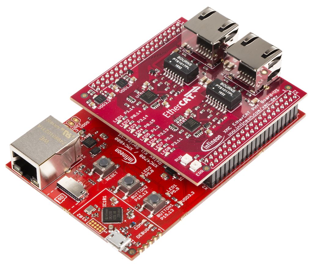 Infineon technologies XMC4800 Relax EtherCAT® Kit is an evaluation kit for the XMC4800 Microcontroller. The XMC4800 family of MCU integrates the EtherCAT® node on an ARM® Cortex®M processor with on-chip flash and analogue/mixed signal abilities. The EtherCAT kit allows you to run an embedded web server and store your HTML web pages on a microSD card. As well as controlling the XMC4800 MCU on your PC via the web browser. The development kit is for EtherCAT slave devices and is ideal for the developing EtherCAT® slaves such as servo drives and intelligent I/O devices.